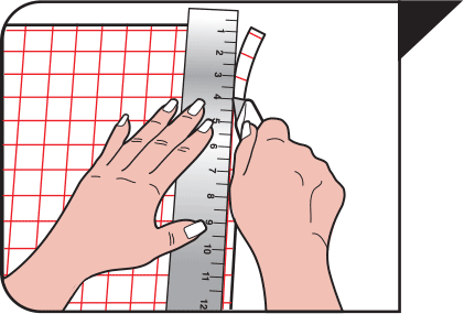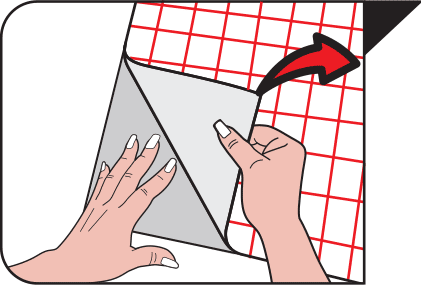 1. Mittaa ja leikkaa tarrakalvo halutun mittaiseksi katkoteräveitsellä hyödyntäen taustapaperin ruudukkoa. Suosi suoria leikkuusaumoja.