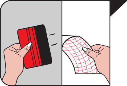4. Irrota tarrakalvo hitaasti taustapaperista samanaikaisesti painamalla kalvoa pintaan kiinni lastalla. Aloita painelu kalvon keskustasta siirtyen reunoja kohden välttääksesi ilmataskuja. Tasoita ilmataskut asennusvaiheessa siirtämällä ilma lastalla keskiosasta kohti kalvon reunaa.