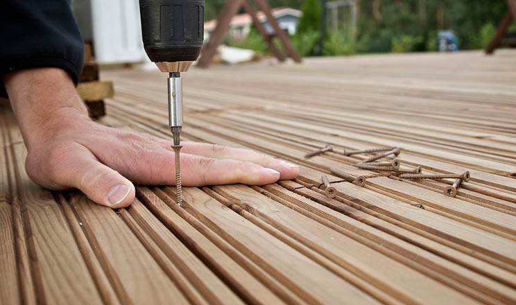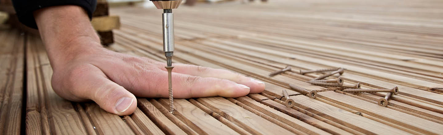 - Käytä terassiruuveja 5 x 60, kaksi ruuvia / liitos. Laudan päädyissä kannattaa porata ruuvien reiät valmiiksi, näin estetään laudan halkeaminen ruuvaus kohdasta.