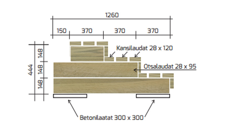 Tutustu myös Kestopuu ry:n terassilaskuriin, jossa voi muokata terassin kokoa ja muotoa sekä valita kansilaudalle eri leveyksiä ja varastopituuksia. Laskuri laskee puutavaran ja kiinnikkeiden menekin. Syöttämällä materiaalien hintoja ohjelmaan, laskuri laskee terassin kustannusarvion: kestopuu.fi/terassilaskuri
