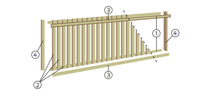 4. Päätyrimat - Katkaise päätyrimat (2 kpl 21 x 95 mm) 800 mm pituisiksi ja ruuvaa (4) ne kaide-elementin molempiin päihin.