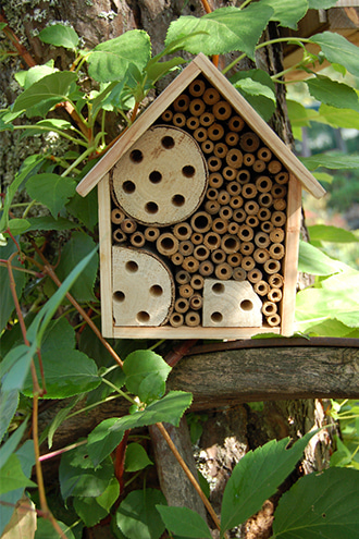 Lahopuiden lisäksi voit tarjota puutarhan hyönteisille pesintä- ja talvisuojan hyönteishotellilla. Kuvassa Hyönteishotelli Oiva.