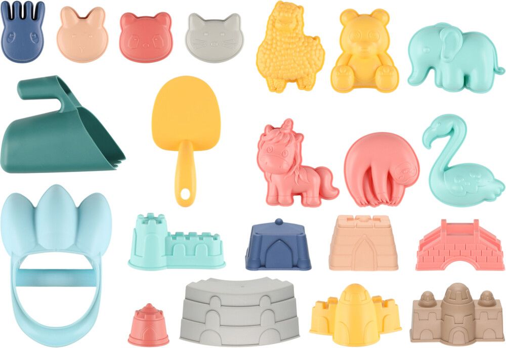 Valikoima erilaisia muovisia hiekkaleluja pihaleikkeihin. Sisältää esimerkiksi eläinmuotteja, kuten yksisarvinen, flamingo ja laiskiainen sekä hiekkalinnamuotteja. Ikäsuositus 18 kk.