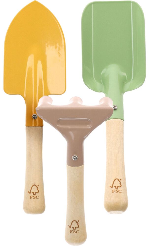 Hauskan värinen 3-osainen istutussetti lasten puutarha- ja pihaleikkeihin. Istutyökaluissa on puuvarsi, teräosa metallia.