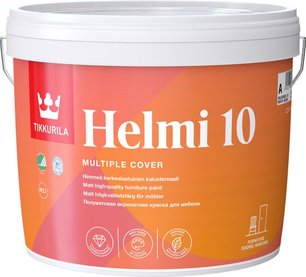 Vesiohenteinen Tikkurila Helmi Himmeä on monipuolinen ja tutkitusti turvallinen sisätilojen akrylaatti kalustemaali, jonka avulla loihdit helposti kestävää kauneutta kotisi pinnoille. Pohjoismainen Joutsenmerkki takaa Helmin olevan laadukas ja ympäristöystävällinen valinta. Siksi sen kanssa on ilo heittäytyä leikkiin ja nauttia värien voimasta. Helmi-sarjan korkealaatuiset tuotteet soveltuvat erinomaisesti kodin erilaisille puu- ja metallipinnoille. Kalusteiden ja pikkuesineiden lisäksi voit maalata Helmillä mm. ikkunapuitteet, ovet, listat, kaapistot ja lämpöpatterit. Tuote kuuluu rakennusmateriaalien päästöluokituksien M1-ryhmään.