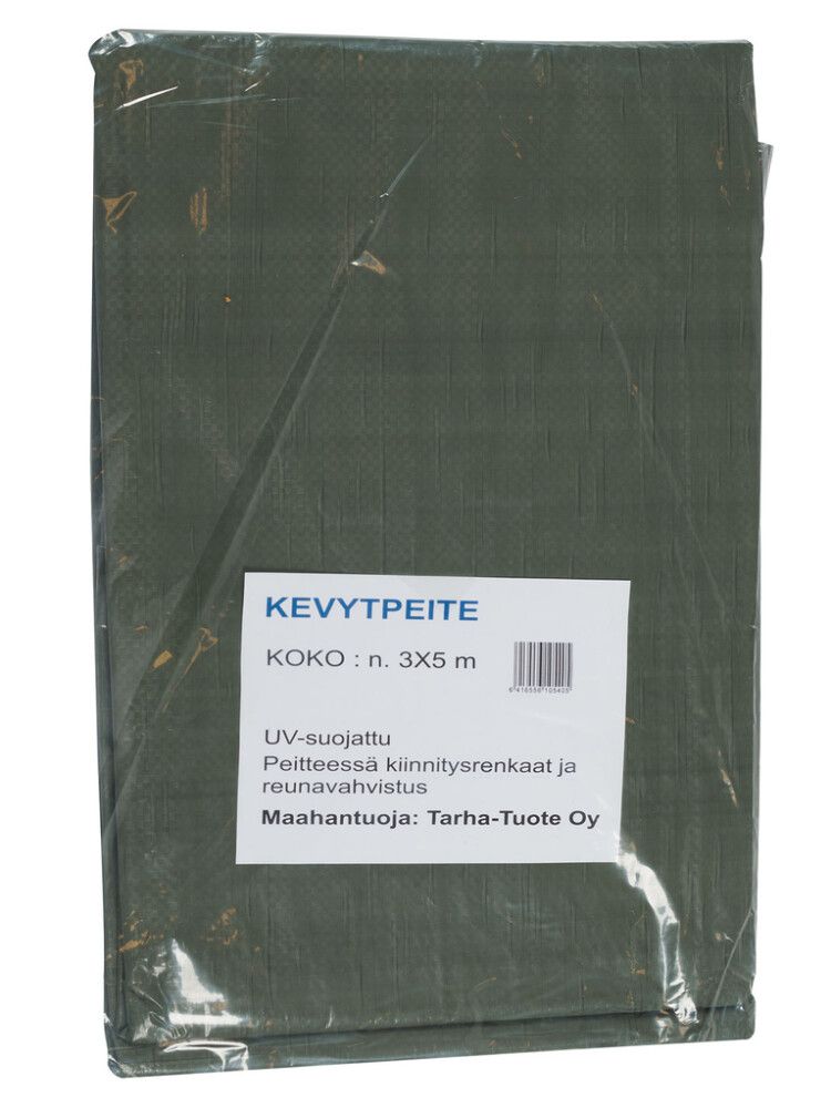 Monikäyttöinen kevytpeite esim. ajoneuvojen, veneen, puutavaran suojaksi. Materiaali UV-suojattua polyeteenia, reunoissa kiinnityslenkit.
