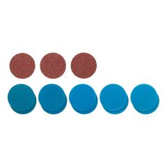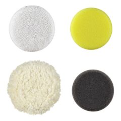 Mukana toimitetaan 50 mm hioma-alusta uritetulla kierteellä, 10x 50 mm hiomapaperilaikat kierreliitoksilla (karkeudet 2x 400, 800, 1200, 1500 & 2000), 75 mm kiillotusalusta, 1x kova kiillotussieni, 1x pehmeä kiillotussieni ja 1x villalaikka.