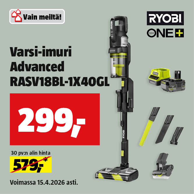 RYOBIVarsi-imuri Ryobi ONE+ Advanced RASV18BL-0379,00 €Tarjoushinta voimassa 10.2.2026 astiSäästösi: 20,00 € Norm. hinta: 399,00 € -