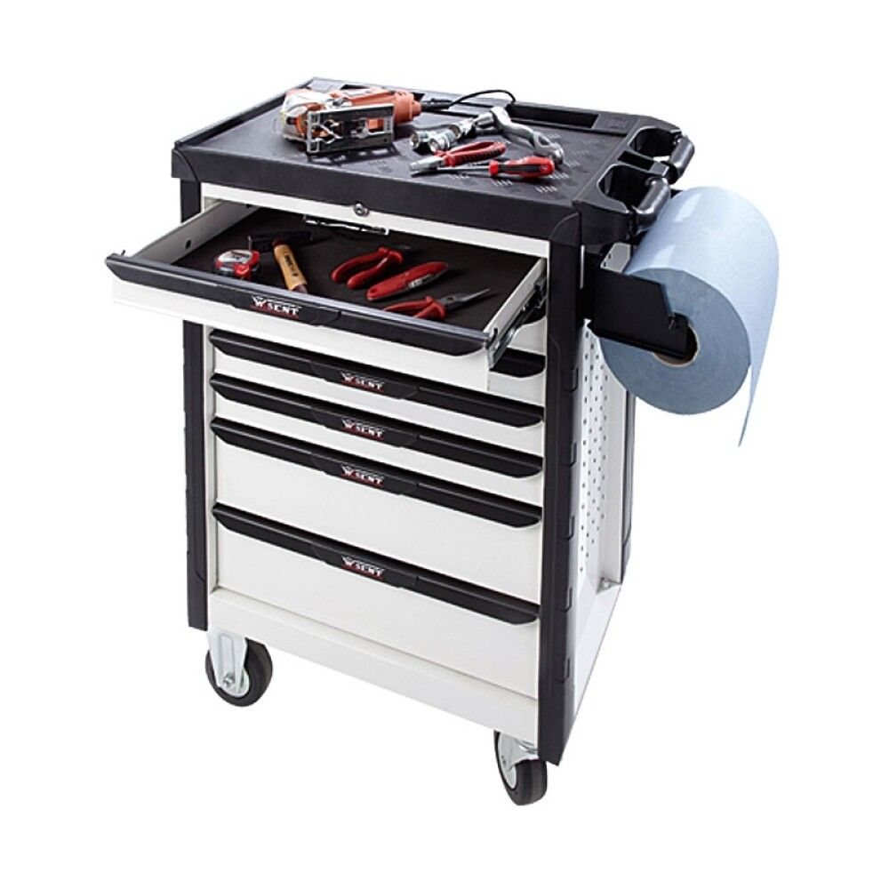 Liikuteltava ja vankkarakenteinen korjaamovaunu jossa suuri työtaso, lukittavat laatikot ja rei’itetyt sivupaneelit.