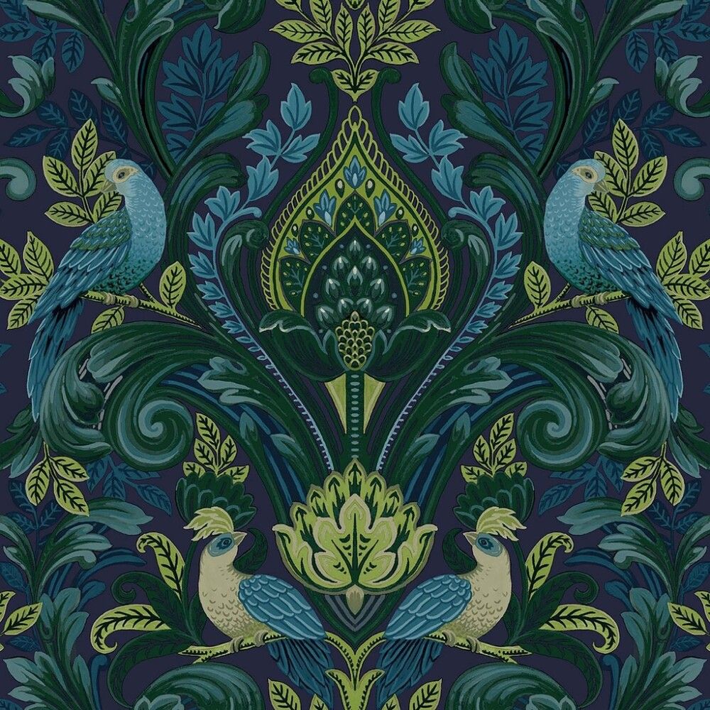 Arcadia Opulent Damask on mustapohjainen ornamentti kuitutapetti. Näyttävä monivärinen tapetti, jossa ornamenttien seassa lintuja. Tapetissa on pintastruktuuri.
