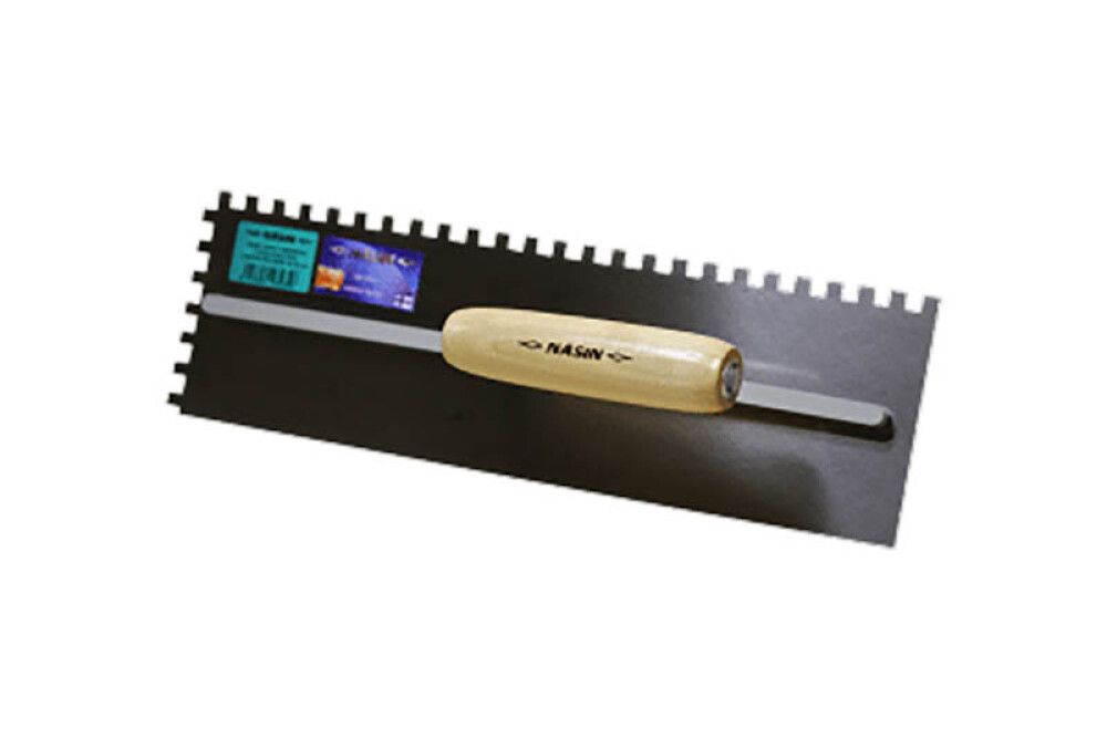 Laastinlevityslaatta Näsin erikoisjousiterästä. Puukahva. Saatavilla 3 eri leveydessä. A2 suorakaidehammastus 6 x 4 x 6 mm.