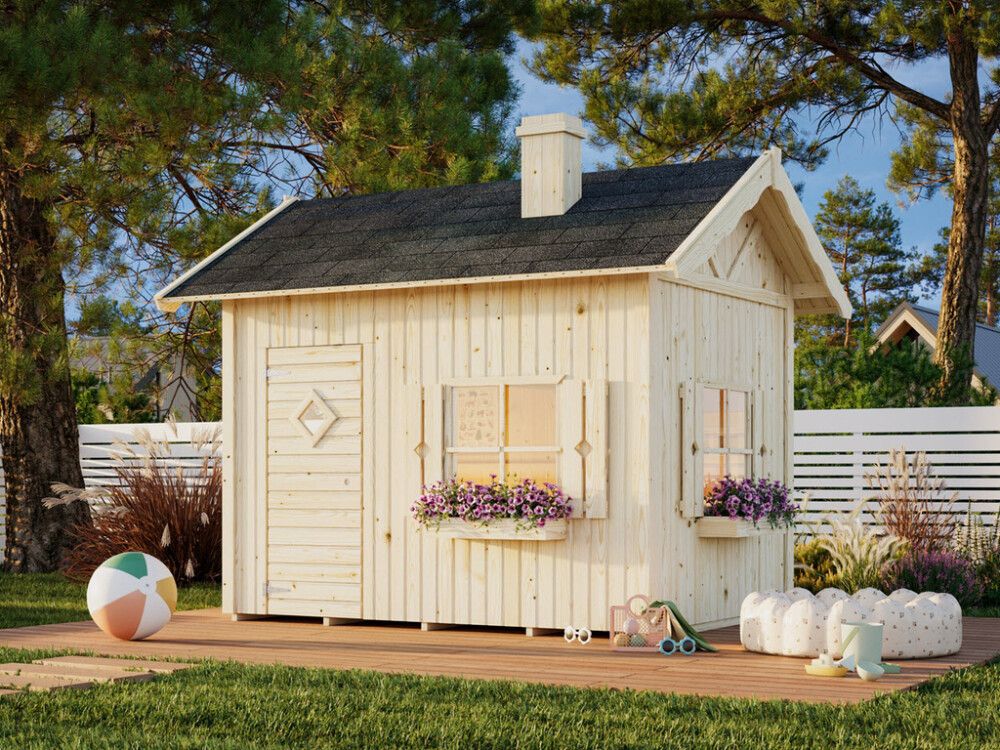 Grete on pohjoismaisesta kuusesta valmistettu laadukas 3,7 m² puuvalmis leikkimökki. Mökki kestää erinomaisesti pohjoismaisen sääolosuhteiden vaihtelun.