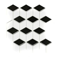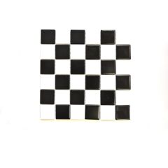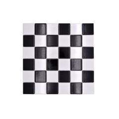 Musta-valkoinen, kiiltäväpintainen mosaiikkilaatta. Mosaiikki on tyylikäs koristeluelementti niin kuivaan kuin kosteaankin tilaan. Yleisimpiä käyttökohteita ovat keittiöiden välitilat sekä kylpy- ja olohuoneet. Tämä keraaminen mosaiikki soveltuu asennettavaksi sekä seinään että lattiaan ja on pakkasenkestävä.