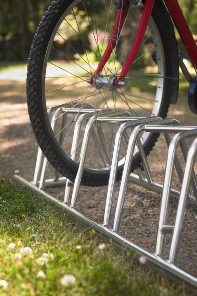 Kolme paikkainen pyöräteline. Kevyt siirrellä paikasta toiseen. Vie vähän tilaa.
