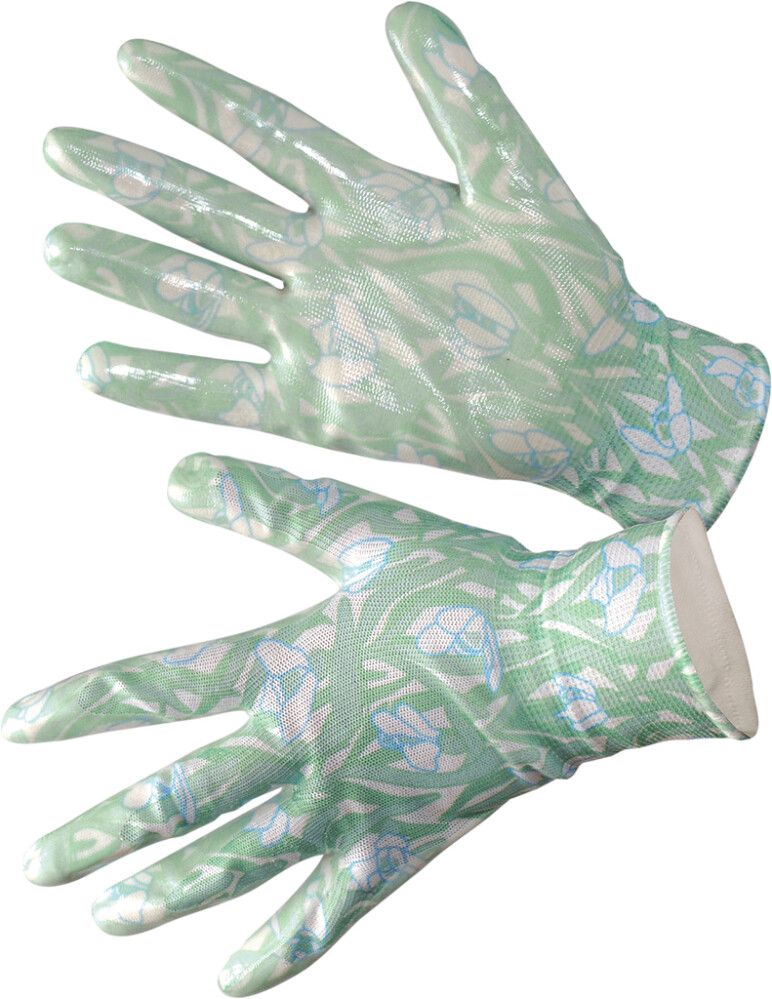 Tyylikäs vihreä retrokuvioinen puutarhakäsine pihatöihin. Käsineet ovat hyvin istuvat ja niillä saa pitävän otteen. Materiaali polyesterineulosta läpikuultavalla nitriilipinnoitteella.