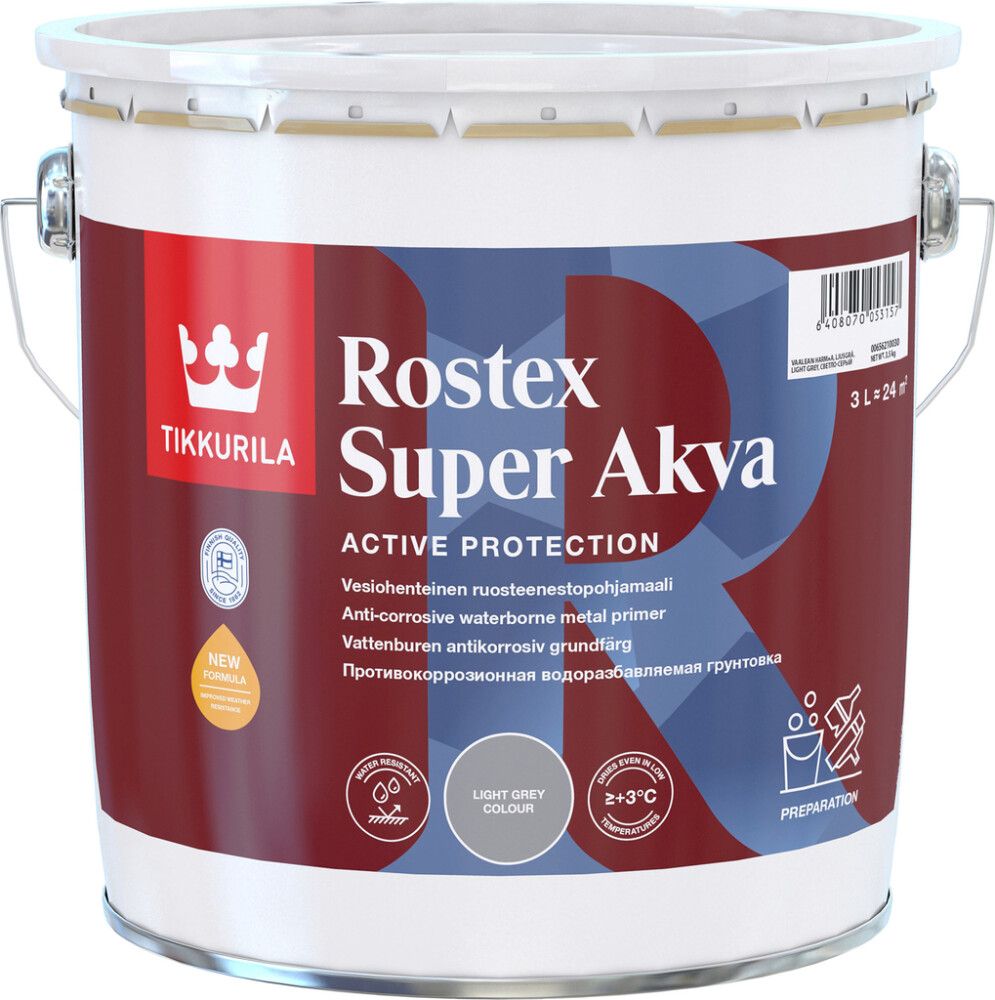 | Tuotenimi | Ruosteenestopohjamaali Tikkurila Rostex Super Akva Vaaleanharmaa 3 l |
