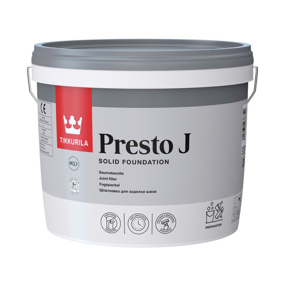 Tikkurilan Presto J saumatasoite on vesiohenteinen, käyttövalmis tasoite kipsilevysaumojen tasoitukseen ja erityisesti saumanauhan kiinnitykseen kuivissa sisätiloissa. Työstetään käsin teräslastalla tai koneellisesti automaattisaumauskone "Bazookalla". Tasoitteen täyttökyky on 2 mm ilman halkeilua. Väriltään tasoite on vaalean harmaa.