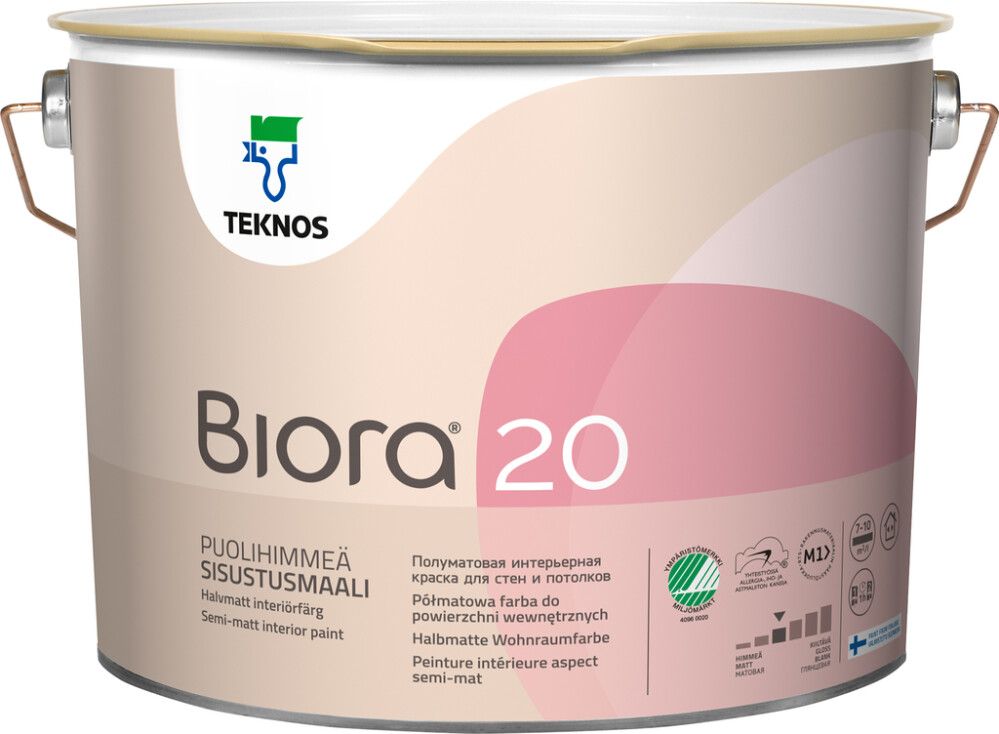Vesiohenteinen, puolihimmeä Teknos Biora 20 sisämaali seiniin ja -kattoihin. Helposti levitettävä, täysin liuotinvapaa akrylaatti, josta haihtuu kuivuessaan vain vettä. Soveltuu hyvän kulutuksenkestonsa ansiosta erityisen hyvin keittiöiden, eteis-, porras-, lasten- ja luokkahuoneiden seinä- ja kattopintojen maalaukseen. Maalipinta on puhdistettavissa ja sen kulutuksen kesto on hyvä. Tuote kuuluu rakennusmateriaalien päästöluokituksien M1-ryhmään. Tuote on saanut Suomen Allergia- ja Astmaliiton allergiatunnuksen käyttöoikeuden.