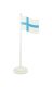 Kaunis puinen Suomen lippu tukevalla pöytäjalustalla.