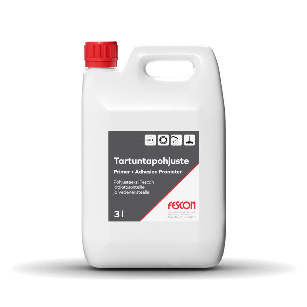 Fescon Tartuntapohjuste on vesiohenteinen tartuntapohjuste (primer) alustan esikäsittelyyn. Tartuntapohjustetta käytetään osana Fescon Vedeneristysjärjestelmää. Soveltuu käytettäväksi myös kaikille Fescon lattiatasoitteille ja seinätasoitteiden rasitusluokan parantamiseen. Parantaa tartuntaa alustaan, sitoo pölyä, ehkäisee ilmakuplien muodostumista sekä estää tasoitteessa olevan veden liian nopean imeytymisen alustaan. Sisäkäyttöön. Pakkauskoko 5 x 3 l/laatikko ja 10 x 1 l/laatikko. Tartuntapohjuste on osa Fescon Vedeneristysjärjestelmää. Sertifikaatti nro VTT-C-870-06.