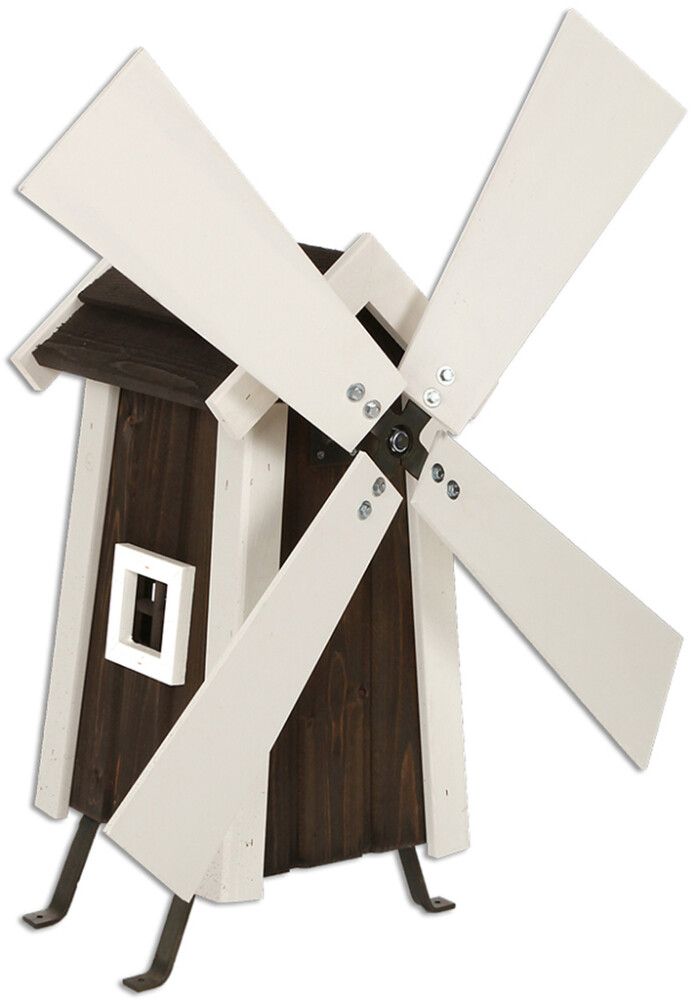 Kaunis kotimaisesta puusta valmistettu tuulimylly pihakoristeeksi. Runko sävytetty grafiitin harmaaksi vesiohenteisella kuullotteella. Muut puuosat maalattu valkoiseksi vesiohenteisella maalilla. Valmistettu Suomessa suomalaisesta puusta.