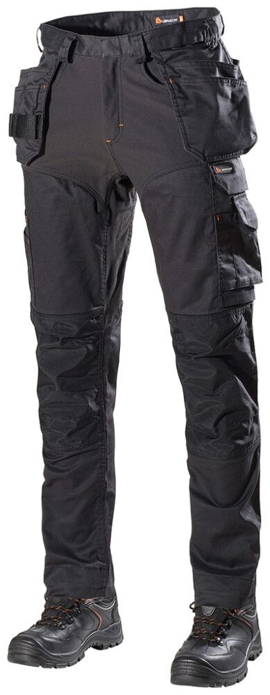 Useita taskuja ja lenkkejä. Etumuksen, haarakappaleen ja takakaarrokkeen stretchkangas takaa hyvän liikkuvuuden ja mukavuuden. Pidennysvaraa 5 cm. Kestää 60 asteen teollisen pesun. Koot 36 - 48.