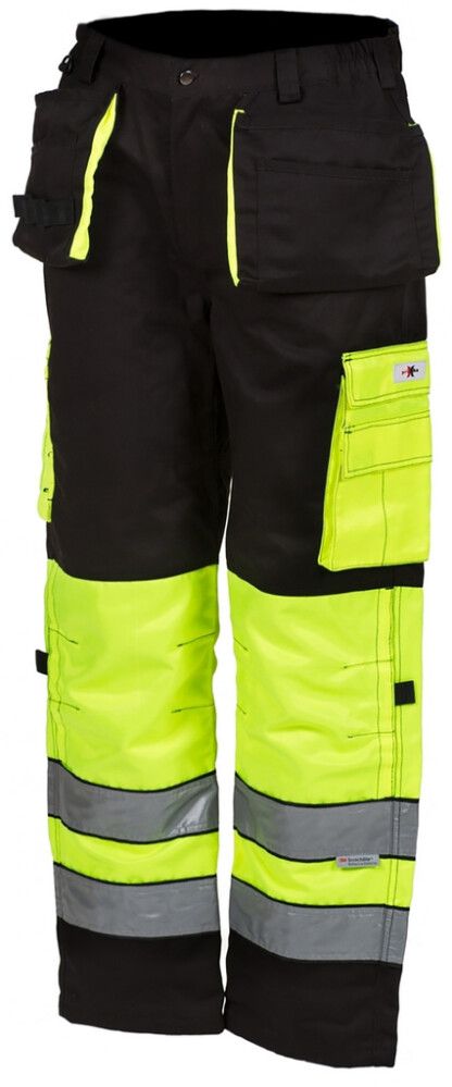 Kelta/mustat riipputaskuhousut, jotka täyttää luokitukset: - EN 20471 lk.1. Housuissa on 16 taskua. Kännykkätasku, vahvistettu läpällinen reisitasku, jossa kynä- ja työkalutaskuja, takatasku, 2 vapaasti riippuvaa etutaskua, toisessa henkilökorttitasku, mittatasku, työkalutaskuja / lenkkejä, D-lenkki. Housujen polvisuojat asetetaan paikoilleen sivusta. Polvisuojien alla on leveät heijastimet. Lisäksi housuissa on paitajarru vyötärössä sekä leveät vyölenkit.
