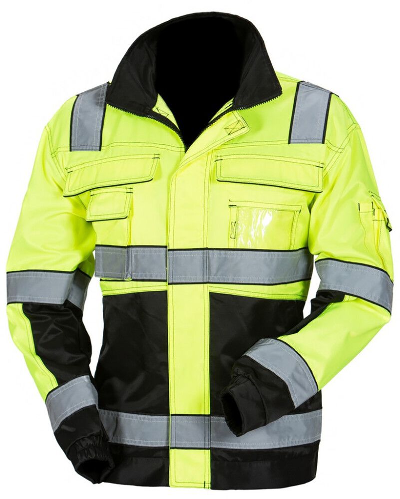 Kelta/musta työtakki, joka täyttää luokitukset: - EN ISO 20471 lk.2 Takissa on 9 taskua. 2 läpällistä rintataskua, joista toisessa D-lenkki, ID-korttitasku, suljettavat sivutaskut, povitasku, hihatasku ja kynätasku. Takissa on ylös kaulukseen asti oleva vetoketju tuulilistalla. Takin heijastimet menevät yliolan. Helmankiristys toimii tarralla. Hihansuissa resorit.
