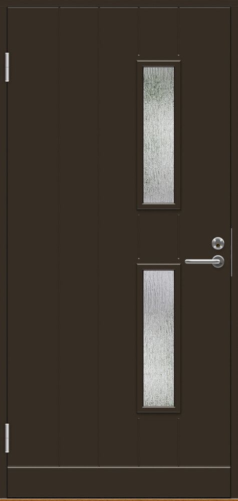 Pinta: Maalattu HDF-levy Väri: tummanruskea NCS S 8005-Y20R Lasi: Argonkaasutäytteinen 2K-selektiivieristyslasi Lasilistat: komposiitti Lukkorunko: LC102, säädettävä vastarauta Tiiviste: Silikonitiiviste ovilevyssä Karmi: Maalattu massiivipuu 44 x 105 mm Saranat: 2 säädettävää 8248 saranaa Kuviointi: Ulkopuoli kevyesti uritettu, sisäpuoli sileä Painike ja helat myydään erikseen.