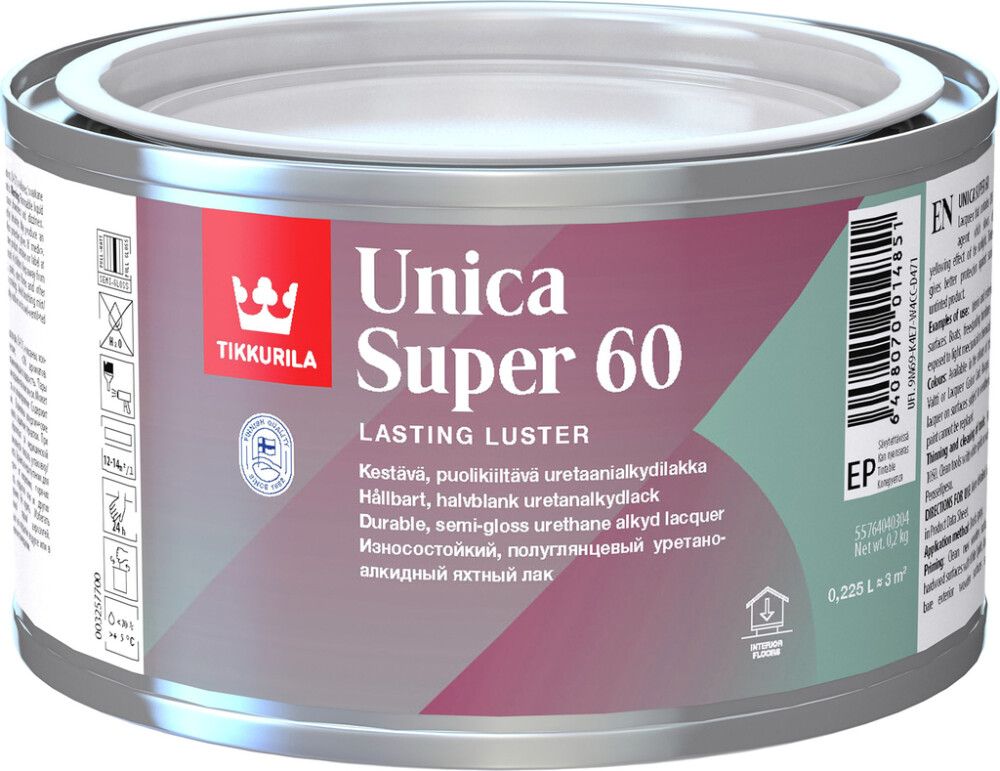 Nopeasti kuivuva Tikkurilan Unica Super uretaanialkydilakka. Sisältää UV-suoja-ainetta, joka hidastaa auringonvalon puuta kellastavaa vaikutusta. Sävytetty tuote suojaa tehokkaammin auringonvaloa vastaan kuin väritön tuote. Soveltuu puupinnoille sisällä ja ulkona. Käyttökohteita esim. veneet, irtokalusteet ja lattiat, joihin kohdistuu lievää mekaanista ja kemiallista rasitusta.
